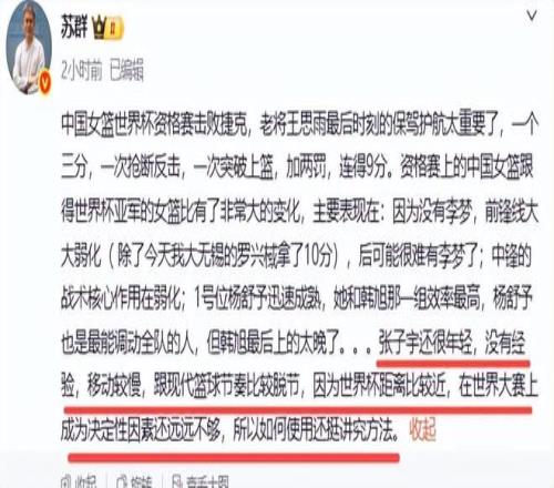10分鐘只得4分,怎么信任她?有時單場失誤5次,殺敵一千,自損八百,也難以信任她。總之蘇群是不看好張子宇在世界杯的表現(xiàn)。不知大家有沒有認(rèn)同蘇群的看法。