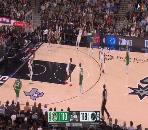 直至時間剩下1分43秒前,塔圖姆的三分投進之后,凱爾特人只以113-118落后馬刺5分,然后,站出來的正是??怂?。