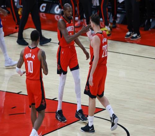 不過,火箭沒有首發(fā)級別的控衛(wèi),失誤控制做得非常不好,大量低級離譜的失誤,上半場火箭沒有一名球員助攻次數(shù)超過2次,當(dāng)火箭在陣地戰(zhàn)中打不開局面,基本就是將球交給杜蘭特,讓杜蘭特解決問題。