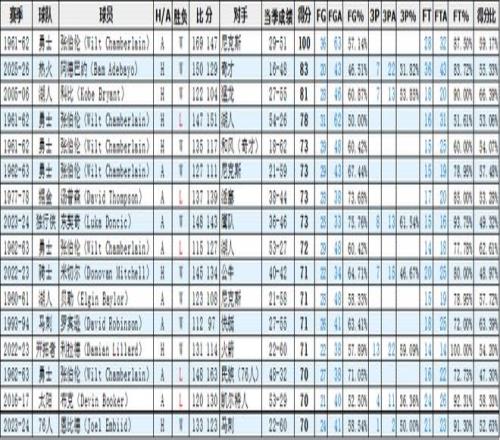 根據(jù)不完全統(tǒng)計,NBA單場70+一共16次,按照得分高低、時間先后排序如下圖所示。