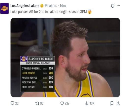 這場比賽東契奇也一戰(zhàn)創(chuàng)造多項紀錄:1.203+三分已經(jīng)超越里夫斯成為湖人隊史單賽季三分命中第二的球員;