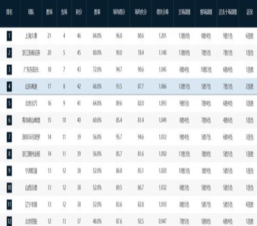 擁有張鎮(zhèn)麟和懷特塞德等新援的上海隊已沖到榜首位置以21勝4負傲視群雄,今年大有登頂?shù)膭蓊^,衛(wèi)冕冠軍廣廈隊20勝5負緊隨其后,廣東隊18勝7負第三,山東隊17勝8負第四。