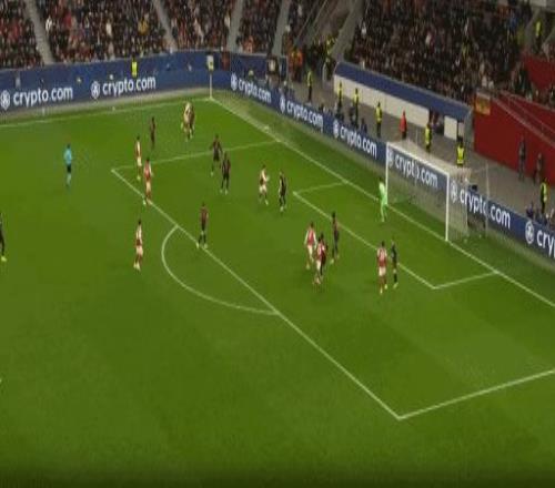 第46分鐘,泰里耶接到隊友左路傳中后,高高躍起頭球攻門,被拉亞神勇?lián)涑觥?/p>