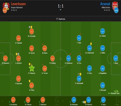 勒沃庫森首發(fā):28-布拉斯維奇、4-夸安薩、12-塔普索巴、20-格里馬爾多、30-馬扎、25-帕拉西奧斯、24-阿萊士-加西亞、8-安德里希、35-科法內(nèi)、19-波庫、11-泰里耶