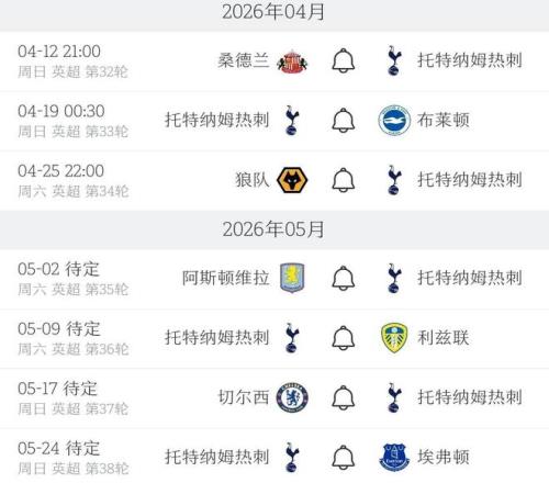 熱刺本賽季英超剩余賽程(北京時間)
