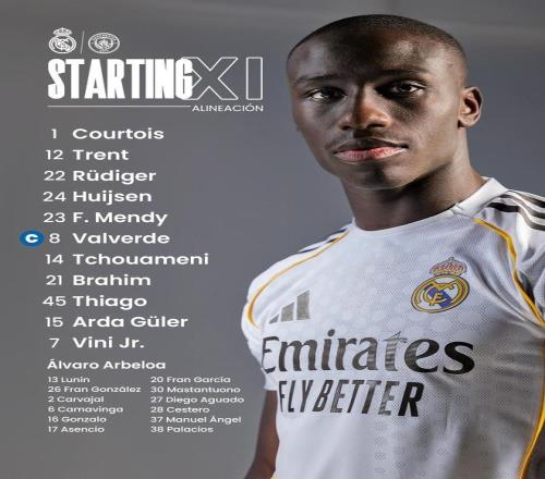 皇馬首發(fā):1-庫(kù)爾圖瓦、12-阿諾德、22-呂迪格、24-赫伊森、23-費(fèi)蘭-門迪、8-巴爾韋德、14-楚阿梅尼、21-卜拉欣-迪亞斯、45-皮塔奇、15-居萊爾、7-維尼修斯
