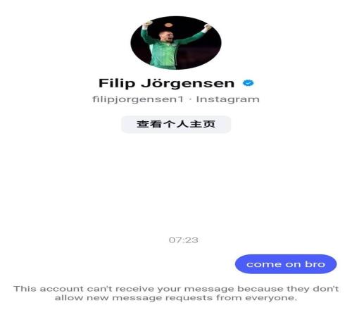 在賽后,約恩森的社交媒體賬號涌現(xiàn)了很多批評和謾罵的言論,網(wǎng)友發(fā)現(xiàn)約恩森關(guān)閉了社交媒體的私信功能,而小編也去核實了這一點(下圖)。
