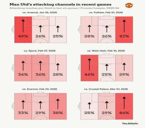 對水晶宮的比賽中,曼聯(lián)左路進攻占比達到本賽季最低水平,如果不是水晶宮打了歐協(xié)杯體力不足,下半場還少打一人,曼聯(lián)能否取勝也會構(gòu)成疑問。