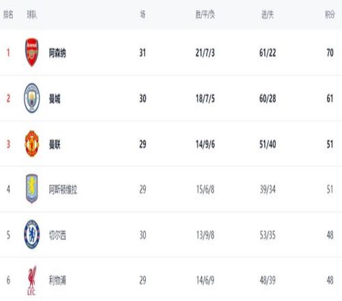 在積分榜上,阿森納以70分高居榜首。曼城掉鏈子,總積分只有61分,排名第2。曼城落后9分之多。顯然,英超冠軍歸屬已經(jīng)基本失去懸念。曼城爭(zhēng)冠只存在理論上的可能性。曼聯(lián)51分,排名第3。第4的阿斯頓維拉也是51分。切爾西輸球,依然是48分,排名第5。利物浦比切爾西少賽一場(chǎng),也是48分,排名第6。熱刺只拿到29分,排名第16。