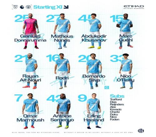 曼城客戰(zhàn)西漢姆聯(lián):哈蘭德、馬爾穆什首發(fā),塞門約出戰(zhàn)