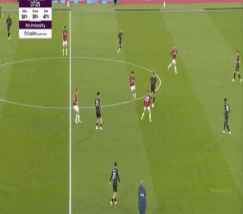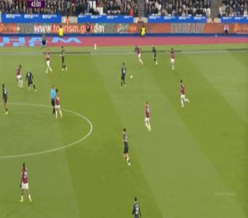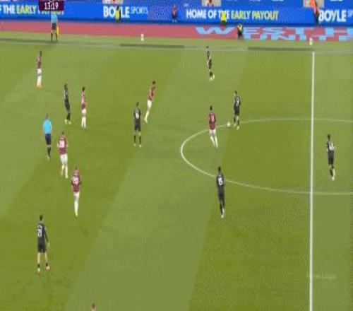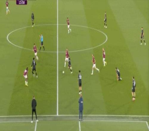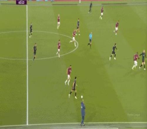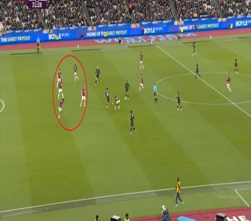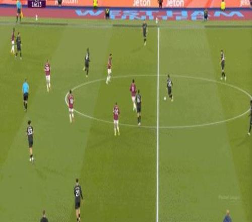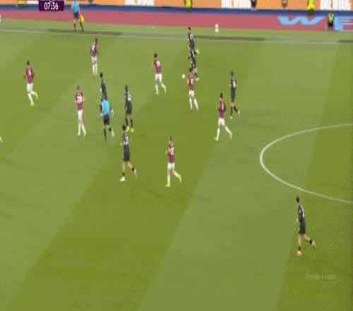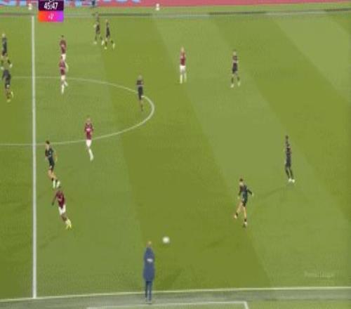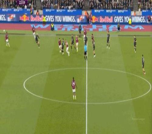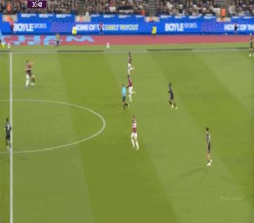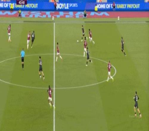 所以,第10分鐘這次進攻打得不錯,只是最后一傳被堵住,但這樣的成功例子,前30分鐘只有這么一次,畢竟西漢姆聯(lián)中場空虛也就這么一次: