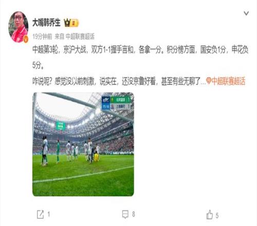前央視名嘴韓喬生則是在個(gè)人社媒這樣寫(xiě)道:“中超第3輪,京滬大戰(zhàn),雙方1-1握手言和,各拿一分。積分榜方面,國(guó)安負(fù)1分,申花負(fù)5分。咋說(shuō)呢?感覺(jué)沒(méi)以前刺激,說(shuō)實(shí)在,還沒(méi)京魯好看,甚至有些無(wú)聊了…”