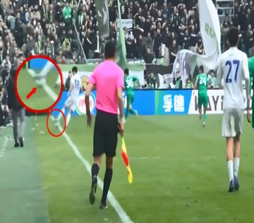 那么,這位申花主帥的抱怨有沒有道理,球是不是真如他所看到的那樣根本沒出界呢?答案很快就給了出來。轉(zhuǎn)播畫面放出劉誠宇帶球的過程片段(下圖),不過這個重放畫面的速度還是太快,外界難以看出是不是出界。