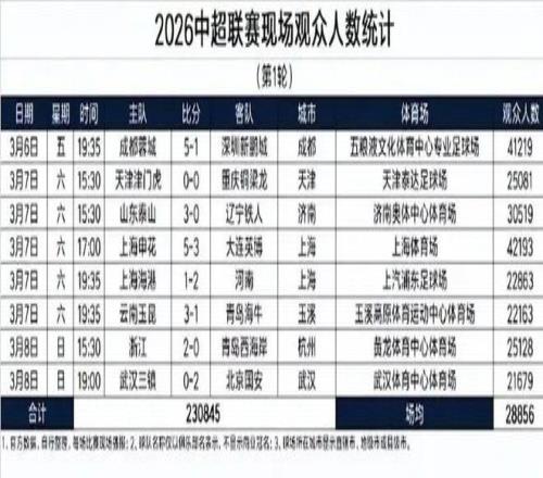 2026中超首輪戰(zhàn)罷,官方公布的一個數字令人欣喜:現場觀眾場均達到28856人。8場比賽,總計230845名球迷走進球場,而...