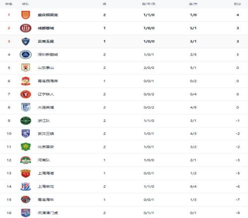 在中超積分榜,重慶銅梁龍2場(chǎng)拿到4分,排名暫時(shí)升到榜首位置。成都蓉城和云南玉昆都是3分,排名第2和第3名。深圳新鵬城1-0絕殺天津津門虎,拿到3分,凈勝球是負(fù)數(shù),只能排名第4。山東泰山兩連勝,積分是0分,排名第5。北京國(guó)安負(fù)2分,排名第11。上海海港負(fù)5分,排名第13。上海申花則是負(fù)6分,排名倒數(shù)第3。